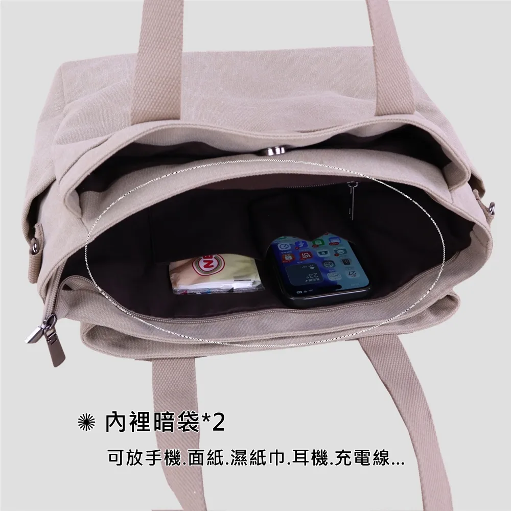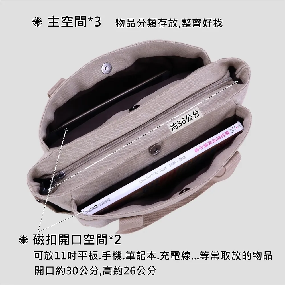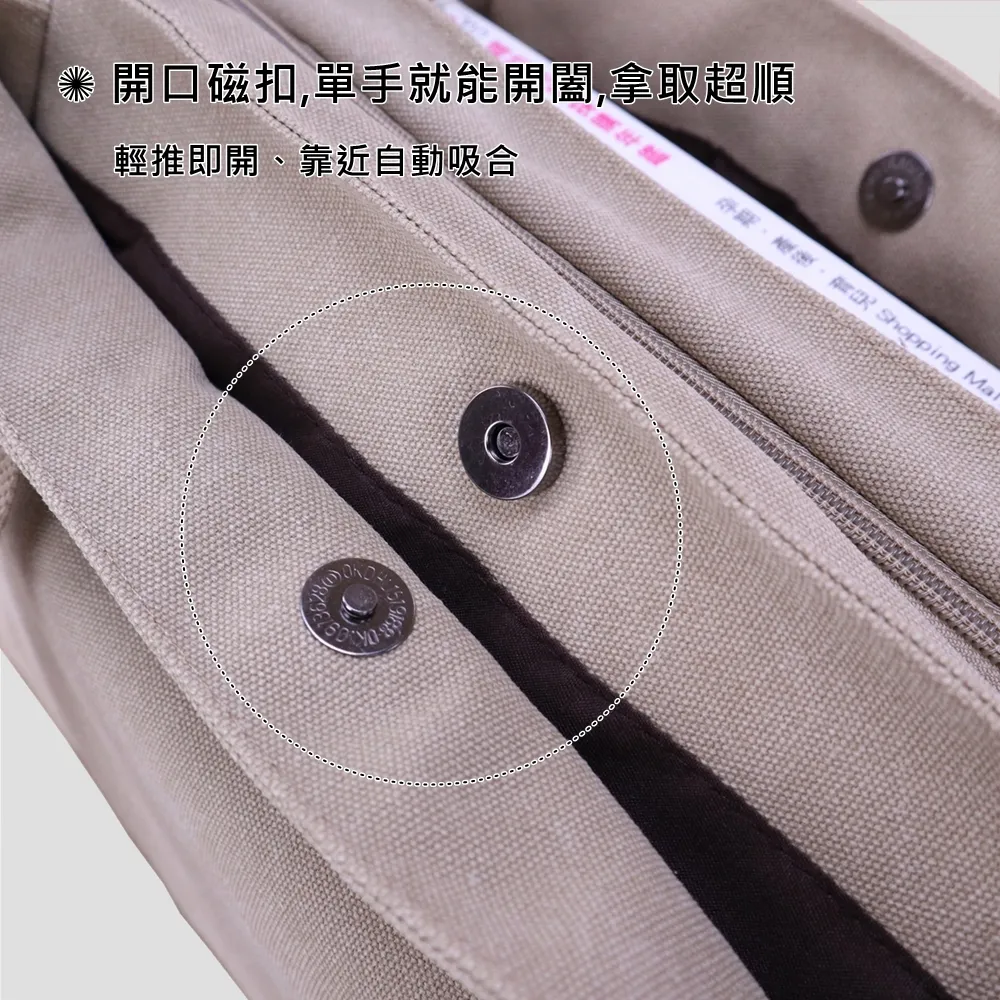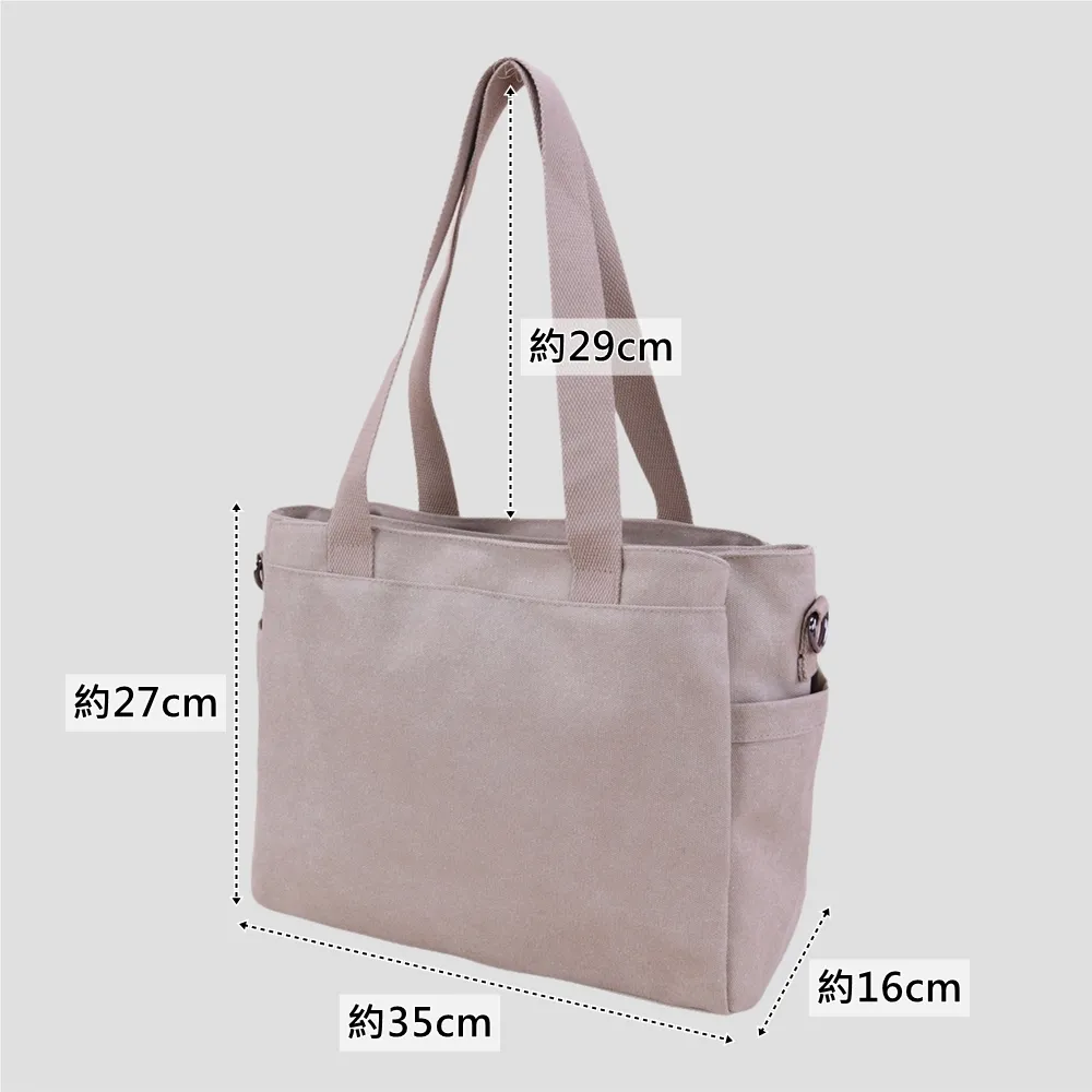 整體線條俐落、不顯厚重,是一款 實用與質感兼具的日常帆布包。