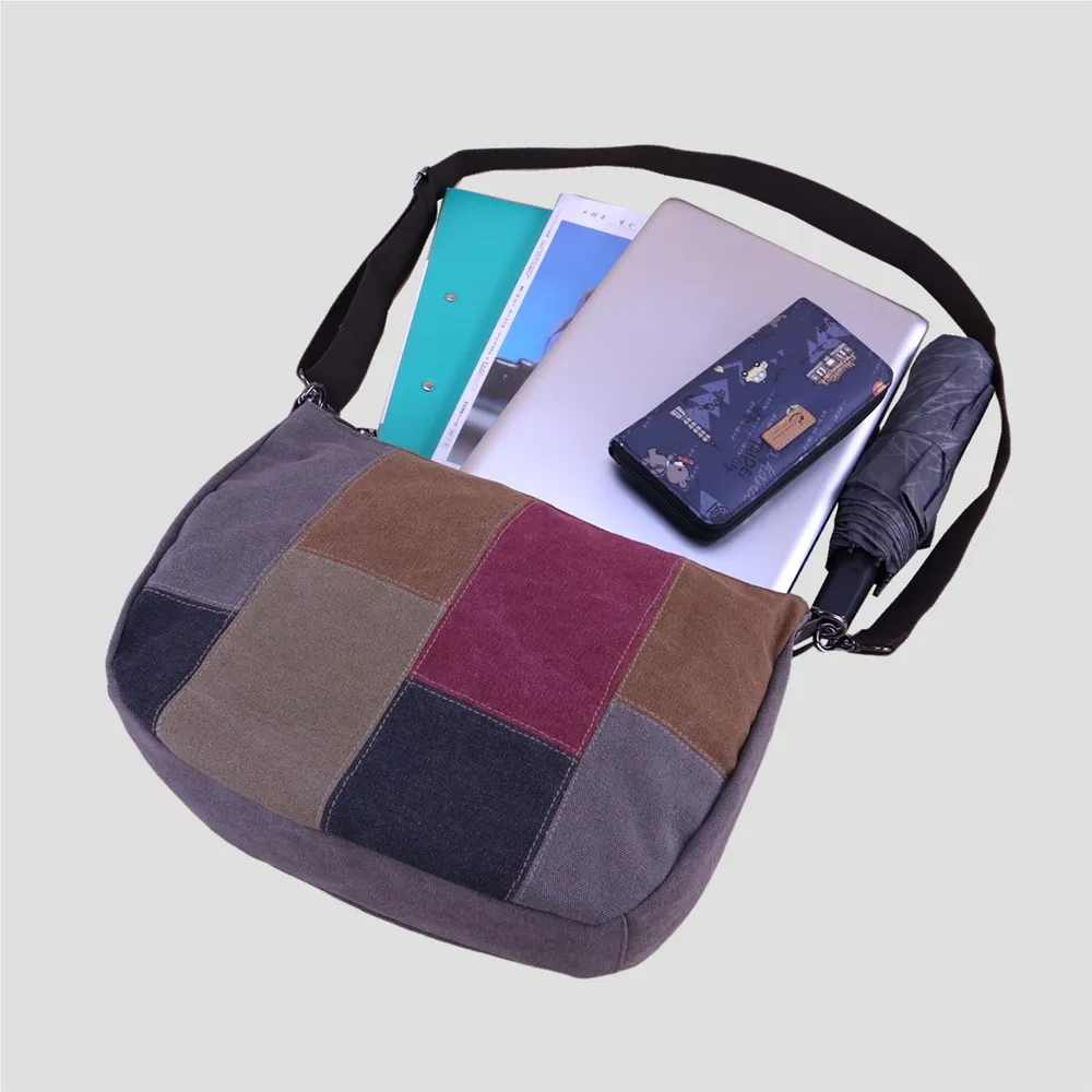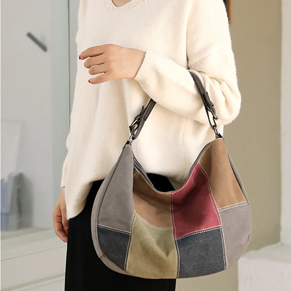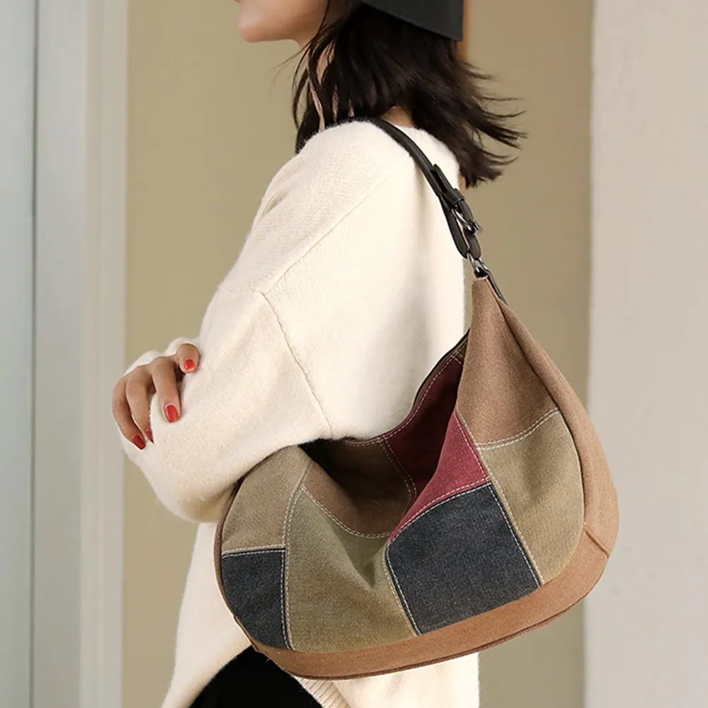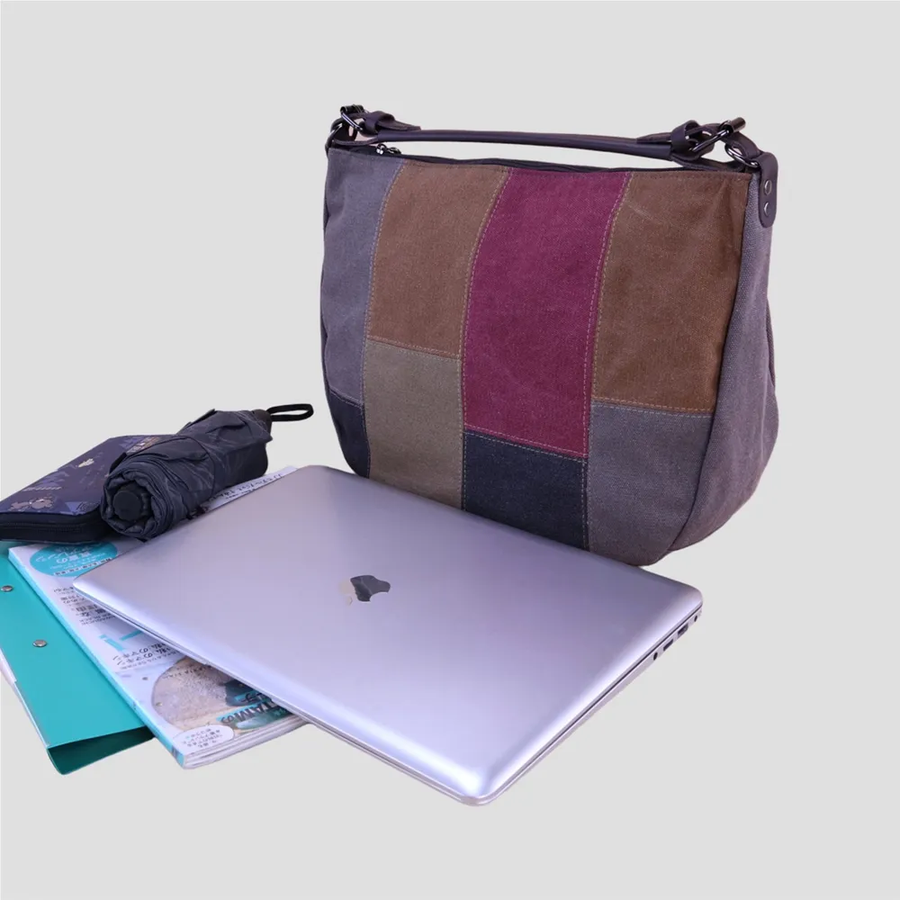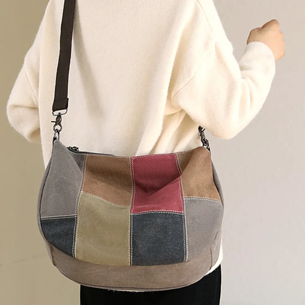 k014 拚色帆布皮革手提把手提包.大容量斜背包
