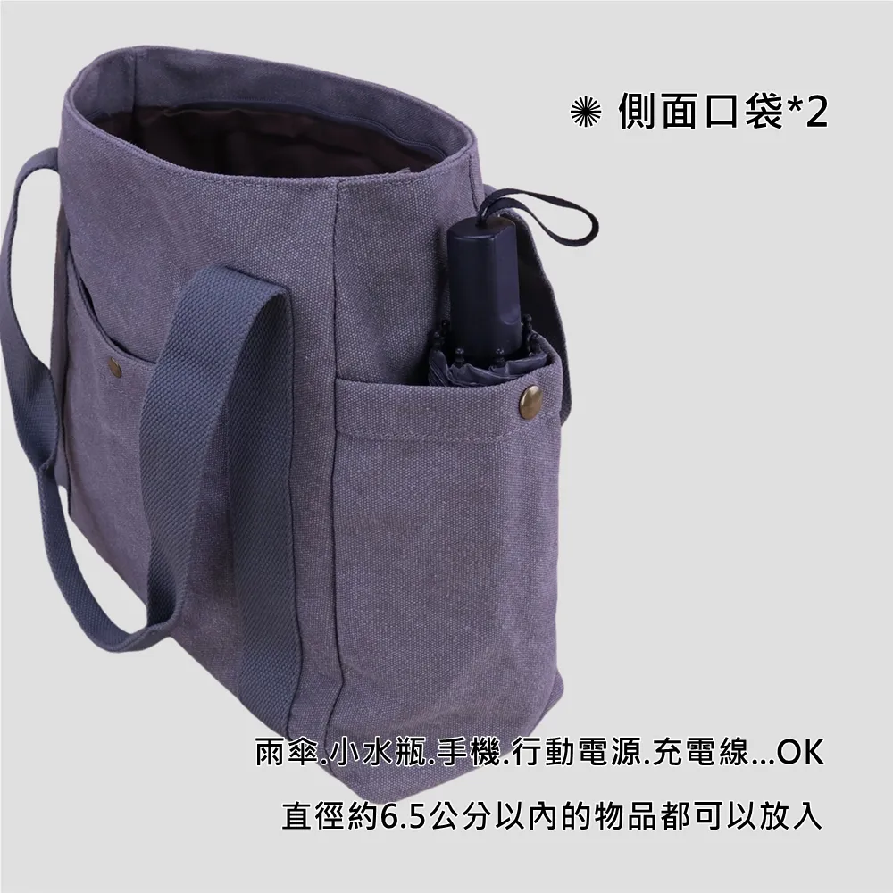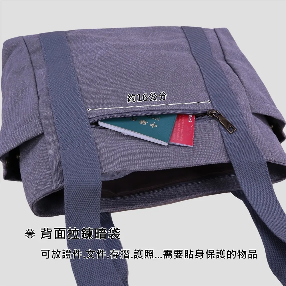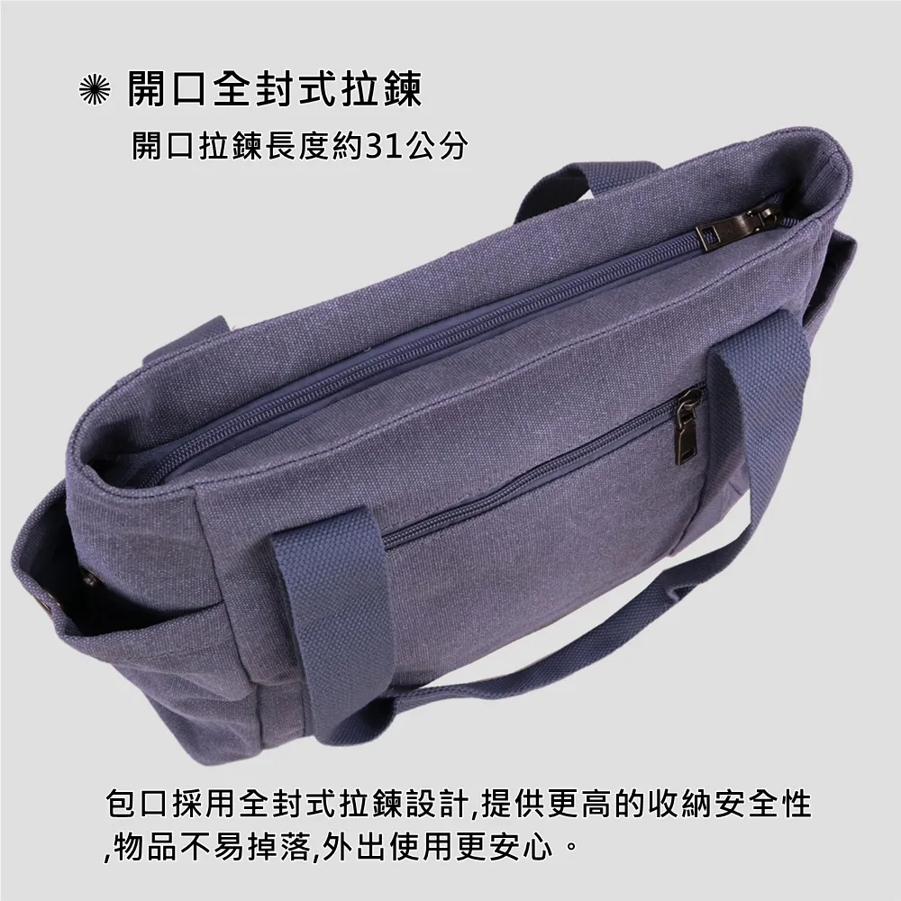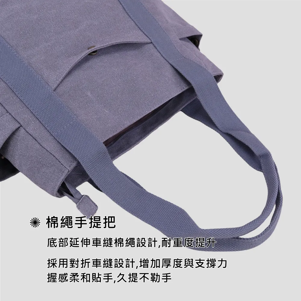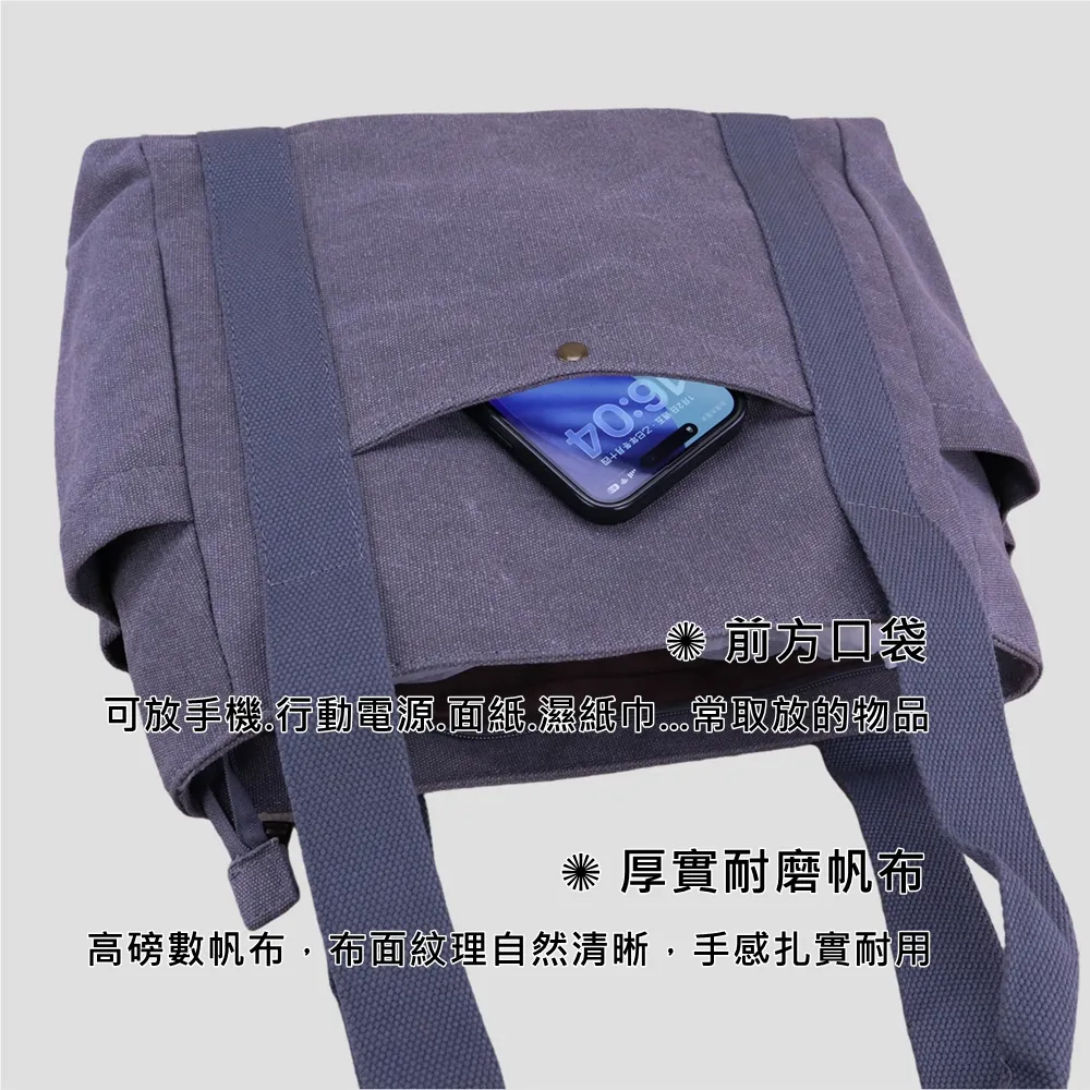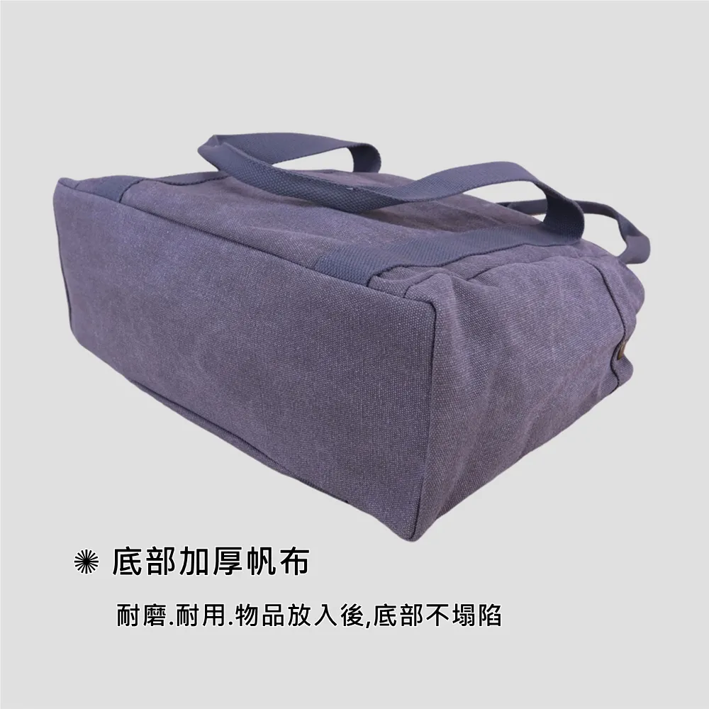 整體線條俐落、不顯厚重,是一款 實用與質感兼具的日常帆布包。