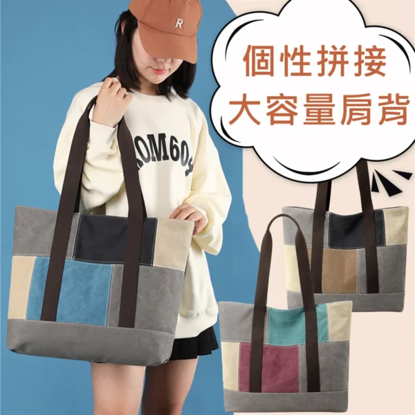 K017拼接帆布大肩背包.媽媽包.大容量托特包