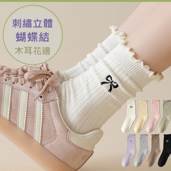 w0065 薄款刺繡蝴蝶結木耳邊堆堆棉襪.中筒襪.襪子 w0065 薄款刺繡蝴蝶結木耳邊堆堆棉襪.中筒襪.襪子